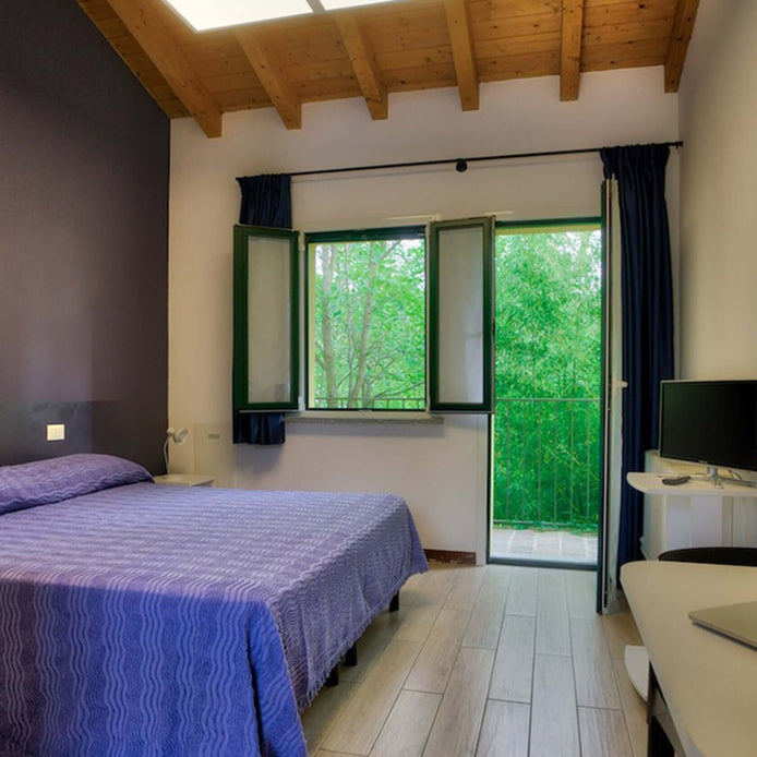 Bungalow PRUGNA Matrimoniale o due letti singoli. Come il terapeutico frutto dell’omonima pianta dell’antistante giardinetto è sobria ed essenziale nell’interno ma riserva la sorpresa del retrostante terrazzo sul bosco con finestra e porta per accedervi.