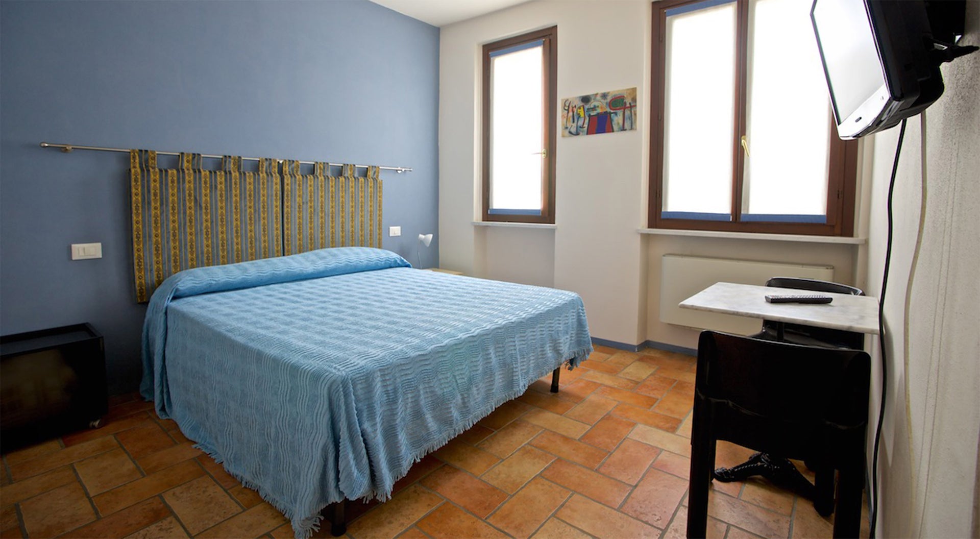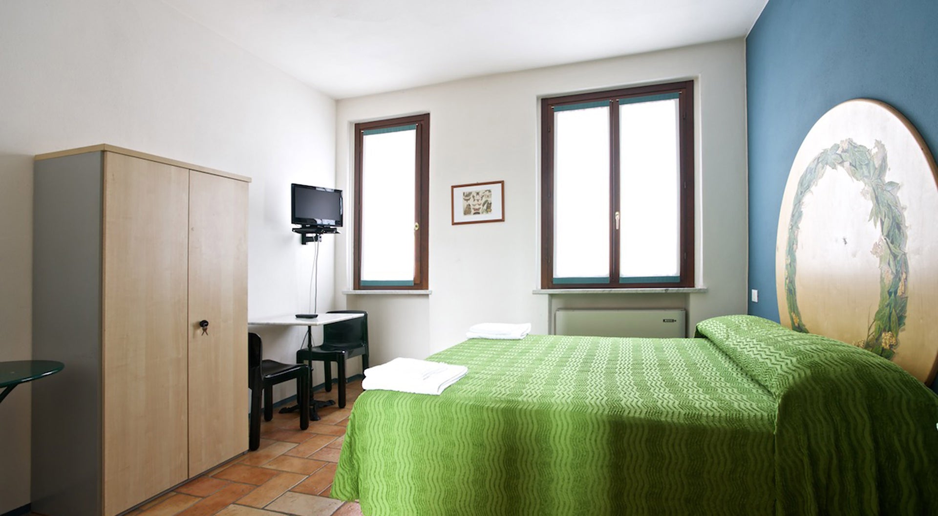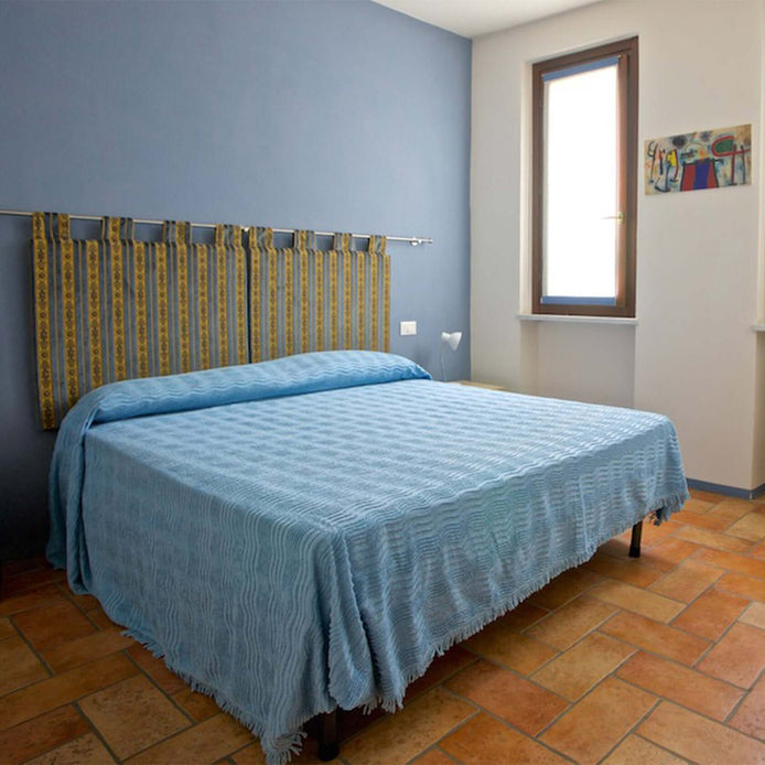 Matrimoniale o due letti singoli al Piano Rialzato della Corte Lombarda, con affaccio sula Piazza dell’Oca e vista giardinetto del Fico, ha piccolo angolo cottura, il tema è ripreso nei colori dell’arredo