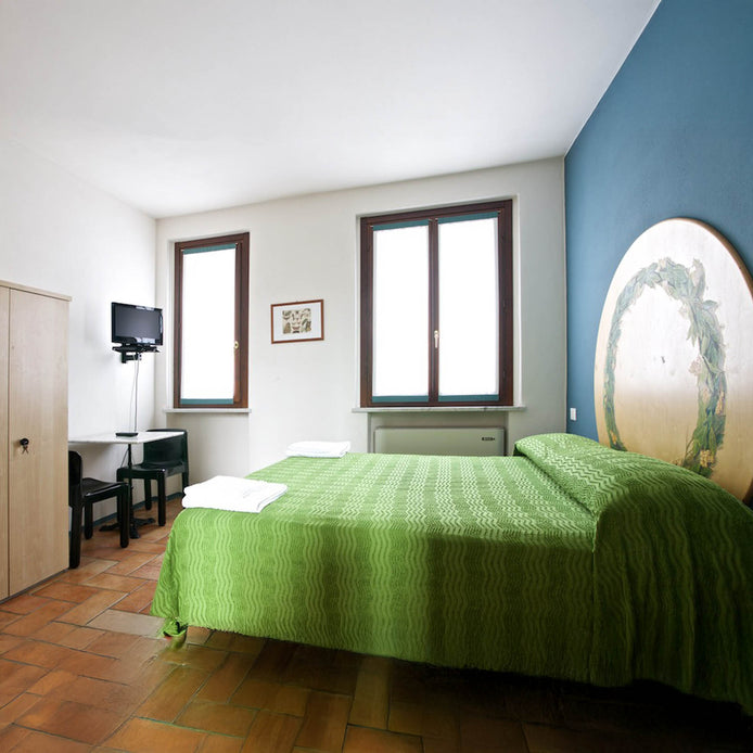 Matrimoniale al Piano rialzato Della omonima Corte Lombarda degli allori, con affaccio sulla piazza dell’Oca e vista giardinetto del Fico, ha piccolo angolo cottura, il tema è ripreso nei colori dell’arredo