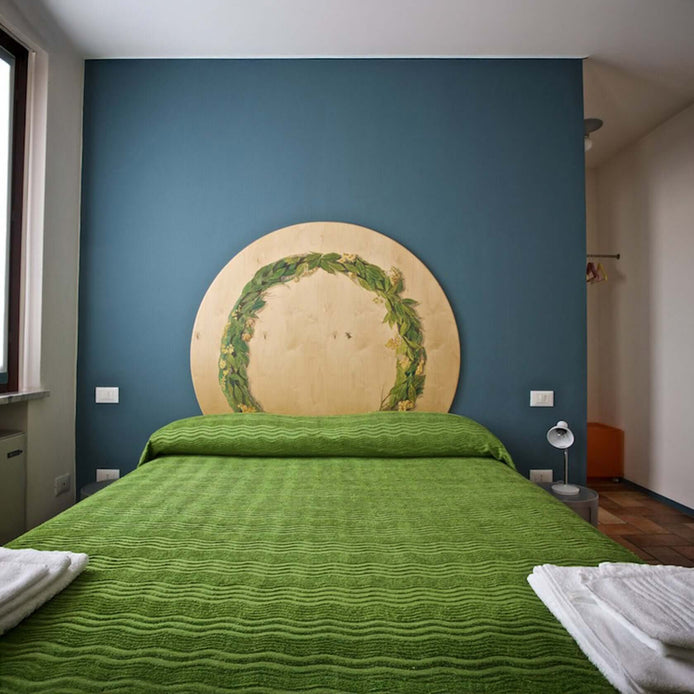 Matrimoniale con possibilità di lettino al Piano rialzato della Corte Lombarda con affaccio su giardinetto sempreverde; il colore dell’essenza che lo denomina è il tema dell’arredo interno (bagno/porte)