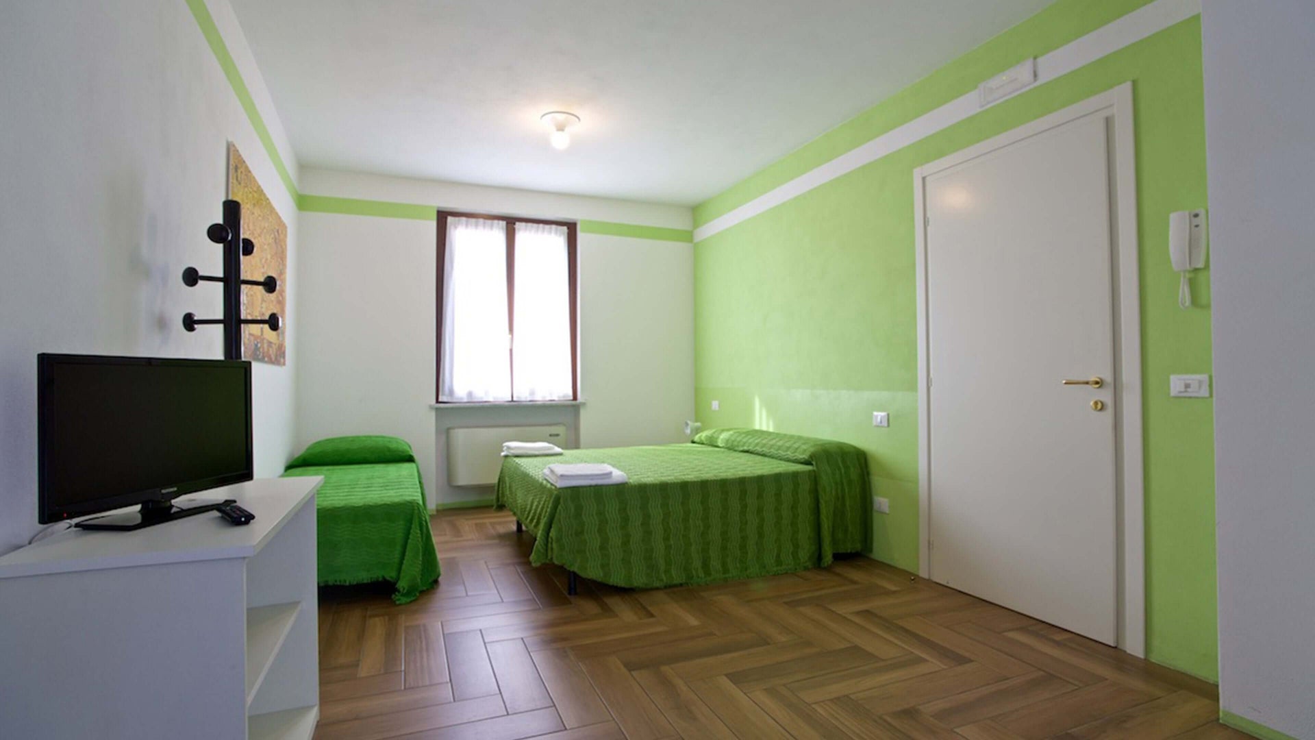 Matrimoniale con possibilità di lettino al Piano rialzato della Corte Lombarda con affaccio su giardinetto sempreverde; il colore dell’essenza che lo denomina è il tema dell’arredo interno (bagno/porte)